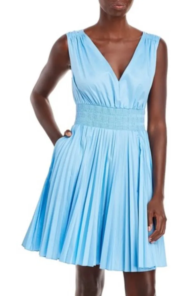 Elevate your wardrobe with this stunning Rebecca Taylor dress. The smocked waist and A-line style create a flattering silhouette for any occasion. The sleeveless, V-neck design is perfect for summer, fall, or spring events, whether they be formal or casual. The dress features pockets and a pullover closure for added convenience. Made of high-quality cotton and requiring dry clean only care, this designer dress is a must-have for any fashion-forward woman. The beautiful blue color and solid pattern make it a timeless addition to your collection. Measurements: Armpit to armpit-17 inches Waist- 13 inches Length- 36 inches