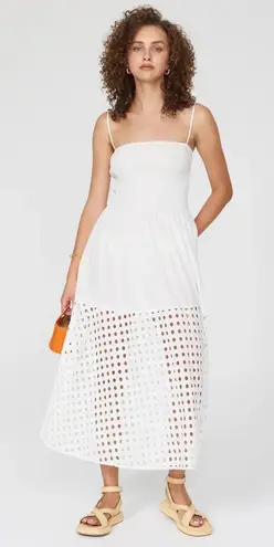 Good preowned condition. There is slight yellowing at the underarm but not very noticeable. Size: XS Approximate measurements with garment laying flat: Stretches to approximately 17” bust, 17” waist, 44” length Color: White The Kennedy midi-dress from Solid & Striped features a smocked bodice and an eyelet-embroidered skirt. Square neck Adjustable spaghetti straps Smocked bodice Pulls over 100% cotton Dry clean OFFERS WELCOME BUNDLE & SAVE MORE SAME OR NEXT DAY SHIPPING ITEMS PACKAGED WITH CARE
