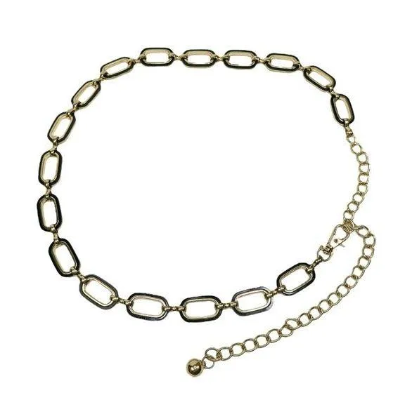 No brand. Metal chain with oval links, reversible with two different designs. One side is solid gold with striped texture detailing. The other side is black with gold around the inside. Adjustable with lobster clasp closure. Versatile with many ways to style! Pair with denim shorts, jeans, a large tee cinch the waist, or a dress. One size fits many (clasp can be fastened to any of the small links) Size: S - L Width: 3/4” Length: 29.5” - 41.5” Good Condition, minimal signs of wear. No rust on metal.