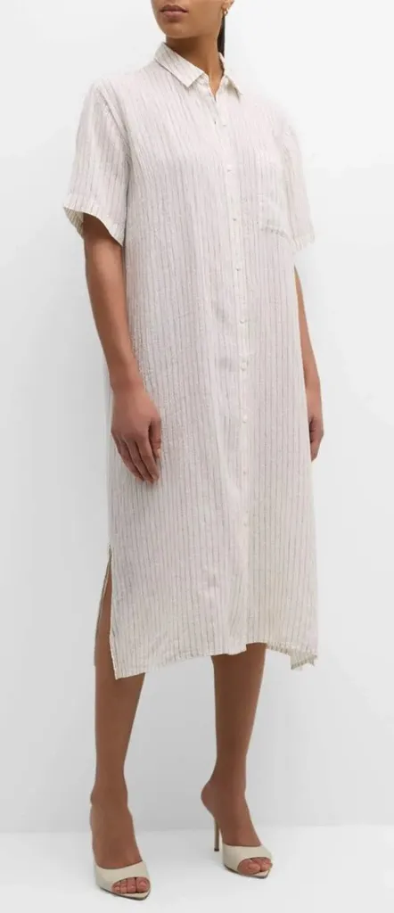 Elegant cream dress with subtle stripes. Button-down front. Short sleeves. Relaxed fit.
