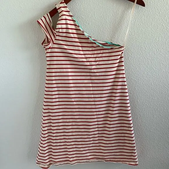 Anthropologie Maeve Striped Marketa One Shoulder Dress. Preowned. There are a few spots on the front. See photo highlighting the flaws. Size: XS - Extra Small Underarm-to-underarm: 15" Length (shoulder side): 31" Measurements are approximate and taken flat. 100% cotton Model image to show style only. ITEM 0203 Striped, Stripes, Classic, Preppy, Red Tan White, One Shoulder, Casual
