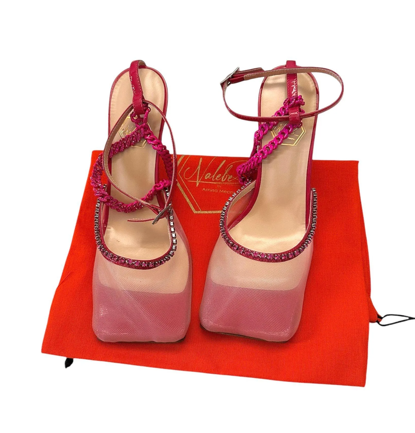 Make a statement with this vibrant shoes. FEATURES: Removable Embellished Chain Ankle Strap Mesh Square Vamp Adorned with Pink Crystals Leather Lining and Sole Made in Italy CONDITION: Brand new with Original Box and Dust Bag Please note that there is pink color missing on the back side of the chain for both shoes.