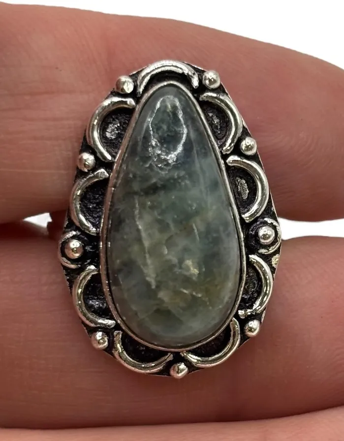 Vintage inspired sterling silver ring featuring a captivating teardrop-shaped stone. This ring showcases intricate, ornate detailing around the bezel setting, adding a touch of bohemian flair. The band is marked '925' indicating its silver purity. Measurements: • Ring Size: 7 • Stone Shape: Teardrop Ring Size: 7 Metal: Silver Number of Gemstones: 1 Main Stone Color: Green Type: Ring Style: Cocktail Material: Stone, Gemstone, Sterling Silver Main Stone Shape: Teardrop Setting Style: Bezel Band Width: 2 mm Keywords: Sterling Silver Ring, Green Stone Ring, Teardrop Ring, Boho Ring, Statement Ring, Vintage Ring, Size 7 Ring, 925 Silver, Womens Ring, Silver Jewelry, Handmade Jewelry, Bohemian Jewelry