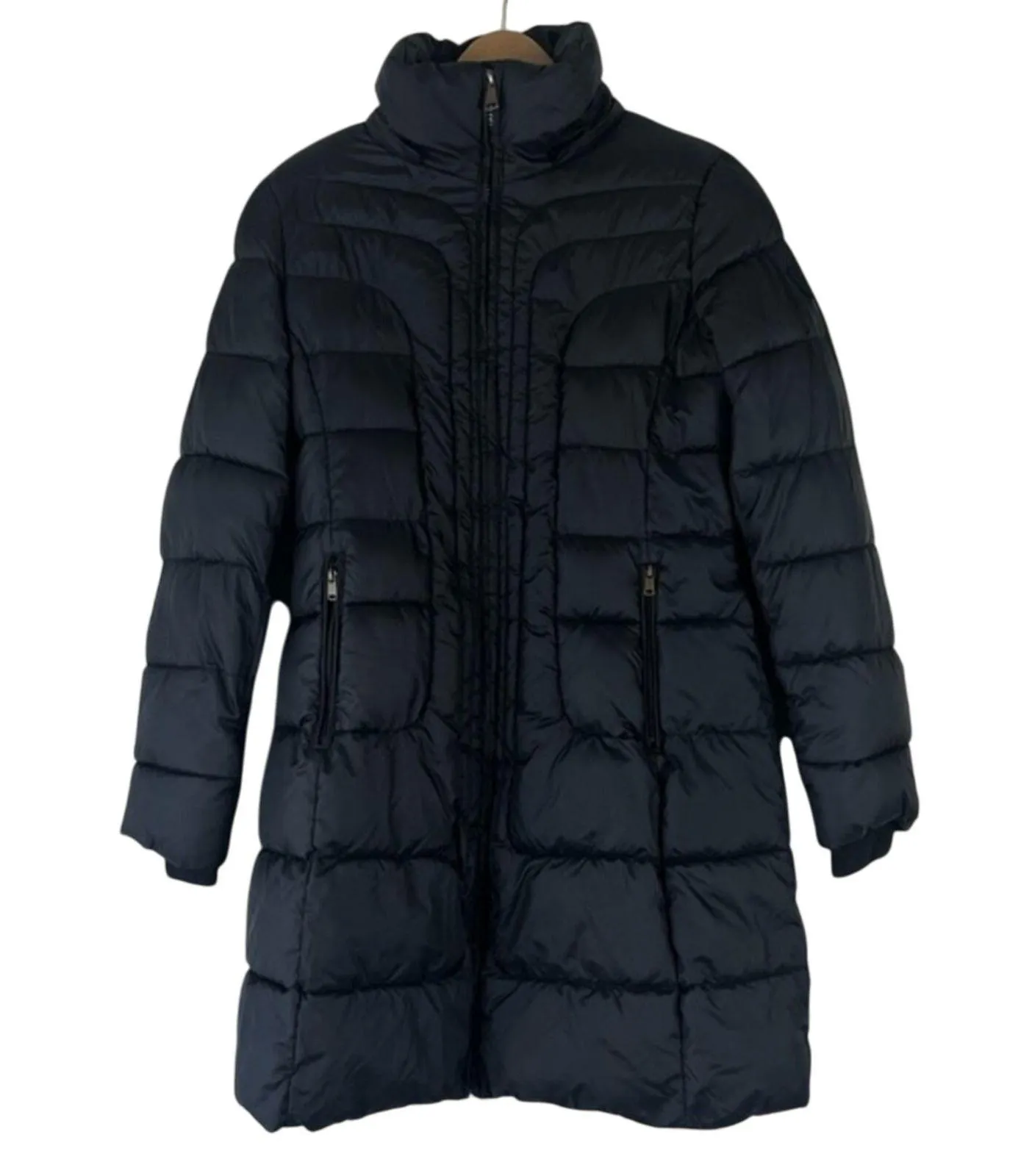 Quilted puffer design High funnel neck for extra warmth Full zip closure with concealed placket Longline silhouette for added coverage Two zippered pockets Faux sherpa lining on upper interior for extra insulation Thick, insulated construction with polyester fill Ribbed cuffs Excellent condition Wintercore; Cozycore; Classiccore; Utility; Functional Fashion; Minimalist; Heritage