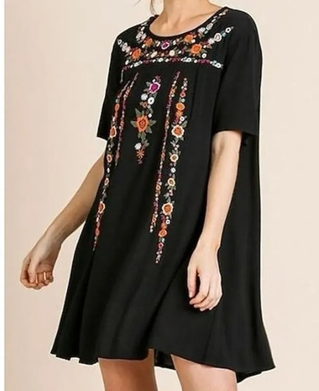 Umgee Tee Dress Black with Colorful Floral Embroidered A-Line Medium Chest 20” Length 33” Excelle... Show more