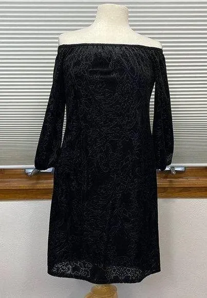 NWT White House Black Market Black Off The Shoulder Velvet Burnout Dress, lined. Size XS Armpit to... Show more