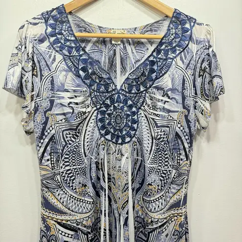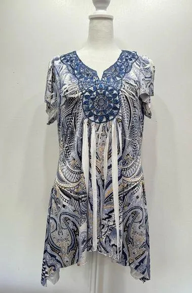 World Unity tunic length blouse. Blue and ivory with black and mustard yellow accents paisley print. Cutout lace medallions with blue rhinestones. Notched neckline, flutter sleeves, asymmetric hem. Pleats with white folds. Women’s size medium. Excellent like new condition. Clean, smoke free home and studio. Five star seller. Super fast shipping! Measurements 20” armpit to armpit 27-34” length *measurements are approximate boho, cottagecore, hippie, gypsy, flower child, prairie, romantic, shabby chic, folklore SKU# 245728 B30
