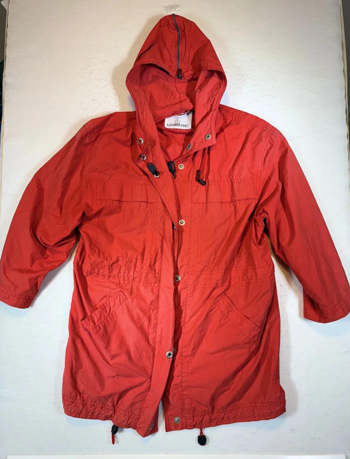 A red hooded anorak jacket from London Fog. This lightweight jacket features a full zip and snap button closure, two front flap pockets, and an adjustable drawstring waist and hem. The attached hood offers extra protection from the elements. Perfect for everyday wear, outdoor activities, or travel. Type: Jacket Outer Shell Material: Polyester Style: Anorak Department: Women Lining Material: Polyester Accents: Zipper, Button Features: Weathergear, Lightweight, Removable Hood Pattern: Solid Season: Spring, Fall Closure: Zip, Button, Drawstring Occasion: Casual, Travel Keywords: London Fog, anorak, red, hooded, lightweight, drawstring, casual, rain coat, outdoor, travel, windbreaker, utility