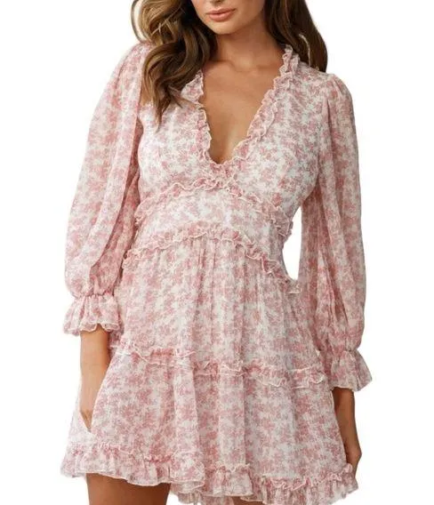The Impeccable Pig Pink Floral Flounce Deep V Neck Dress size Medium Great condition EXCEPT the dress is missing a button on the top back which does not really affect wear Open back with bottom zipper closure Lined Approximate measurements: 18” pit to pit, 31” long Dress, flounce, ruffles, sexy, feminine, boho, bohemian, spring, summer, beach, vacay, vacation, date night, the impeccable pig, women’s, ladies