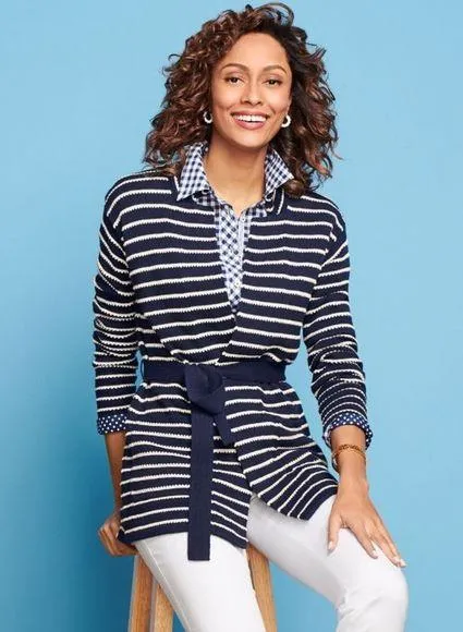Talbots Supersoft Belted Cardigan Sweater. Cotton / Cashmere Blend. Navy blue & white stripes. Tie b... Show more