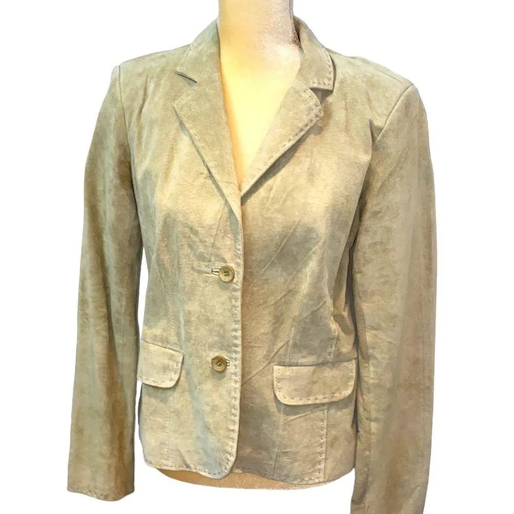 New Frontier sage green 💯 suede jacket/ blazer. Floral lining. Top stitching throughout. Flap pockets. Two button closure. Fitted at waist. Beautiful with jeans, dresses or skirts. Size 10. NWOT. 22” length 23” shoulder to cuff 21” pit to pit