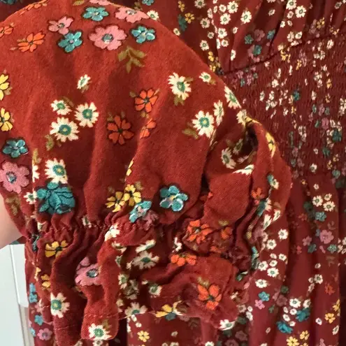 Same or Next Day Shipping! Turn heads in this adorable maroon floral mini dress, featuring a smocked waist for a flattering fit, long balloon sleeves with elastic cuffs, and a tie-front neckline for a feminine touch. Great Preowned Condition! Bundle and Save! Pit to pit laid flat approx. 19"+ (rutched/stretchy) Length approx. 27" 1891 bohemian boho feminine dainty fall pumpkin spice transitional spring whimsical cottage south western maroon burgundy ditsy smocked waist tiefront neckline balloon sleeves fall spring festival chic casual trendy