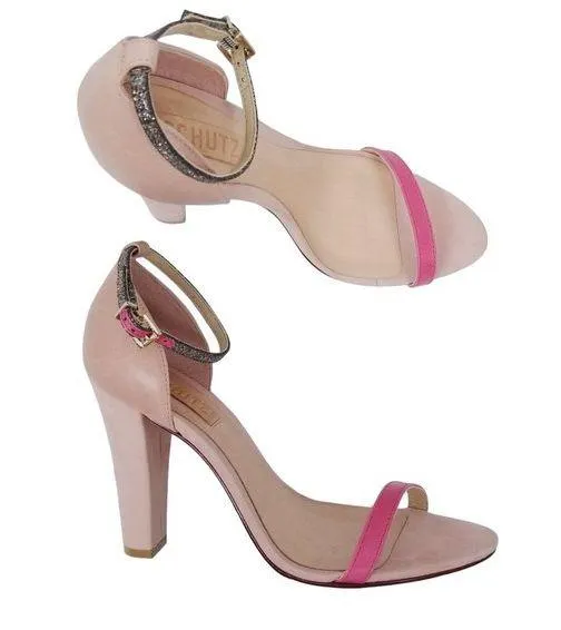 Schutz strappy heeled sandals in light pink leather. Size 9. Minimalistic sandal with Barbie-pink colored toe strap, contrasting ankle strap in black Nand pink with silver glitter, and buckle closure at ankle. Light wear to soles and heels, and pen mark on soles. Approx measurements: Toe to heel: 10.25” Heel height: 4.5” Offers welcome