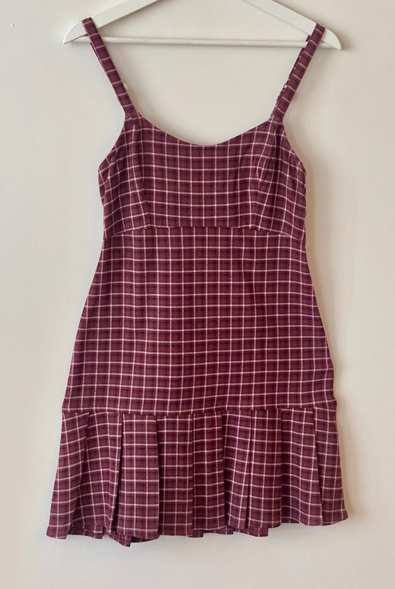 Short plaid dress with pleated skirt Rushed back Adjustable straps Side zipper hidden closure
