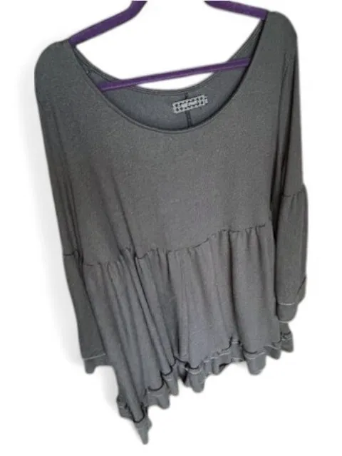 Flowy babydoll silhouette with flattering scoop neckline Tiered ruffled hem for a romantic, dreamy finish Subtle bell sleeves (18.5" long) with gentle flare Dark charcoal gray tone for versatile styling Soft, heavier-weight fabric — perfect for cooler days 26" from shoulder to hem 49" waist (loose fit for comfort and drape) Wear as a short dress or tunic over leggings Easy to dress up with boots and layered jewelry or dress down with tights and a cardigan Style tags: boho chic, cottagecore, soft goth, witchy elegance, romantic grunge, vintage fairytale, dark academia, modern mystique, dreamy layers, feminine edge, ethereal comfort, cozy romance, moody minimalism