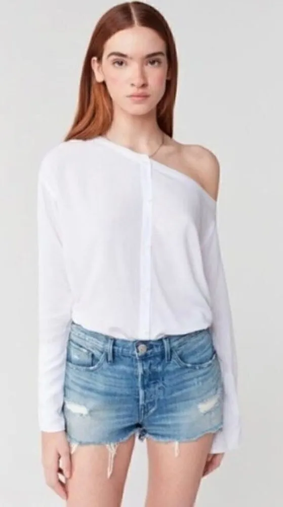 Our W2 Mid Rise short features a relaxed fit with silver hardware. Size 27. The Bleeker wash is a medium blue with abrasions and a partially destroyed hem. * Mid rise boyfriend fit. * 13 oz. denim from Candiani (Italy) * Silver 3x1 buttons front closure, top button visible * Navy stitching * Proudly made in the USA * Style number: WSXLB0866 Measurements are approximate (laying flat): Waist: 17” Length: 11” Fabric: 100% cotton Deadstock