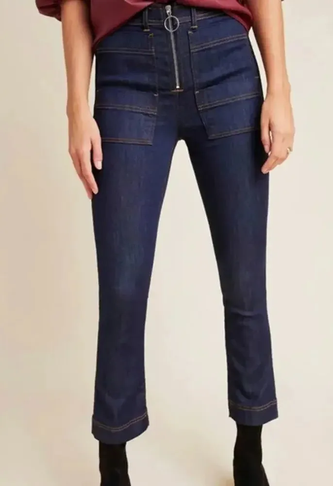 Slim leg, high rise, cropped ankle Exposed O-ring design zipper with no button Two flat front pockets on either side, and regular flat rear pockets Dark blue denim is perfect for fall, and the 27" inseam allows you to show off your favorite booties 92% cotton, 6% elastomultiester, 2% elastane Made in USA Size 27 Measurements~~ 27" Waist 10.5" Rise 26" Inseam Excellent condition, no flaws