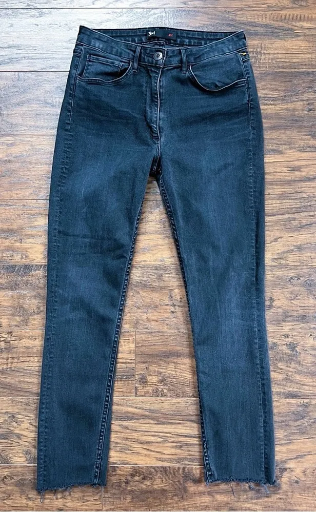 Fabulous ankle cropped skinny jeans by 3x1. “Split-Seam Skinny Mid-Rise Jeans” style in "Black No. 5" (a washed black). Split hem detail with raw frayed edges. Style no W3SSS0191. Waist 27-29“, rise 10.5“, inseam 25“. Size 27, excellent preowned condition. All measurements taken with garment lying flat & doubled where applicable.