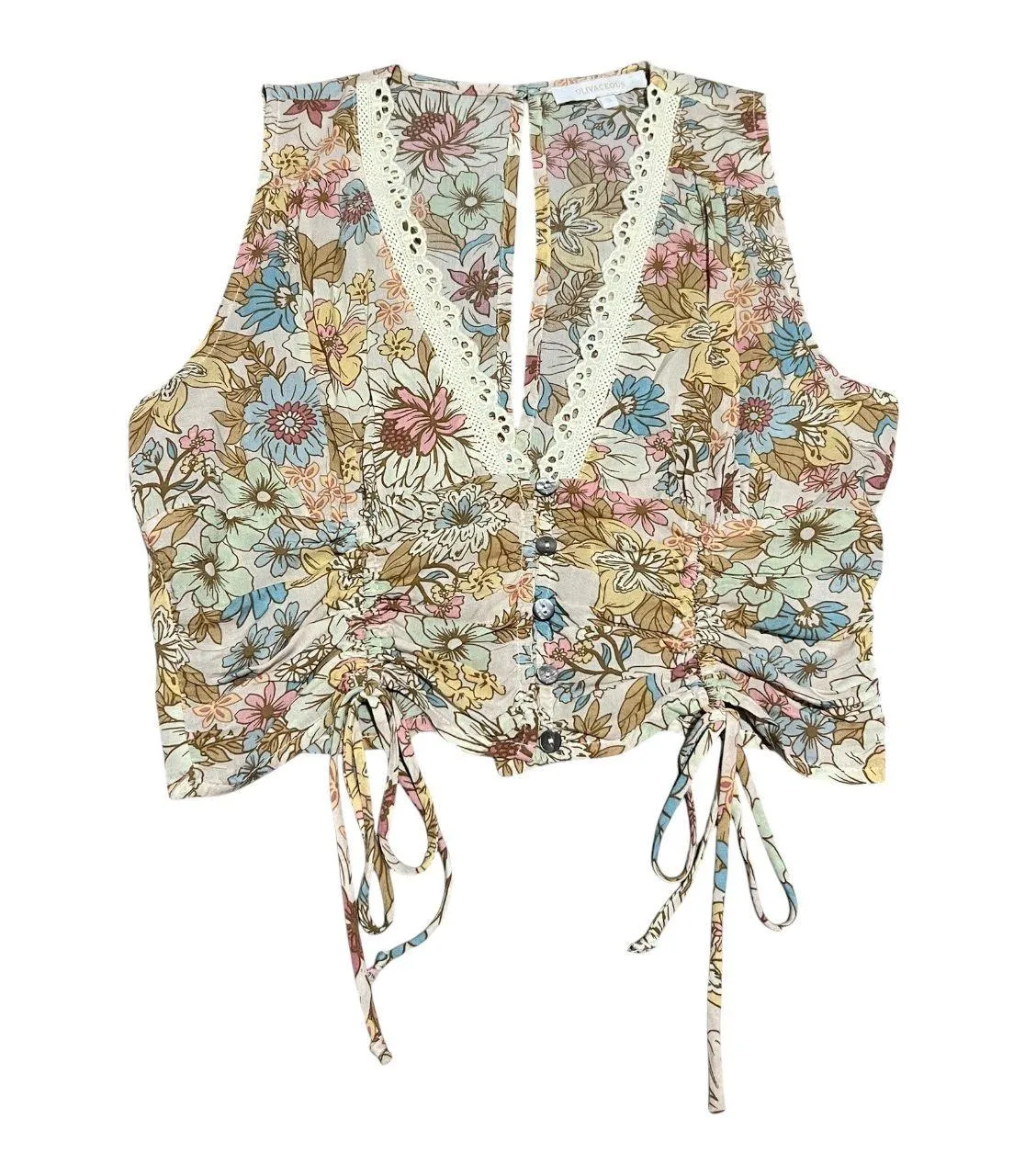 Olivacious Cropped Floral Crop Top with low v cut, lace details and ruching