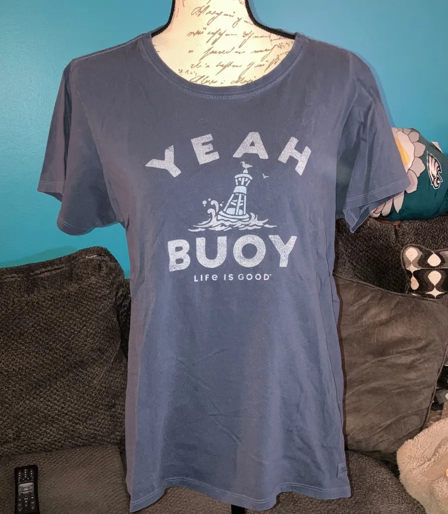S938: Life Is Good Women's Yeah Buoy Short Sleeve Crusher Tee Size Large Navy with white wording I... Show more