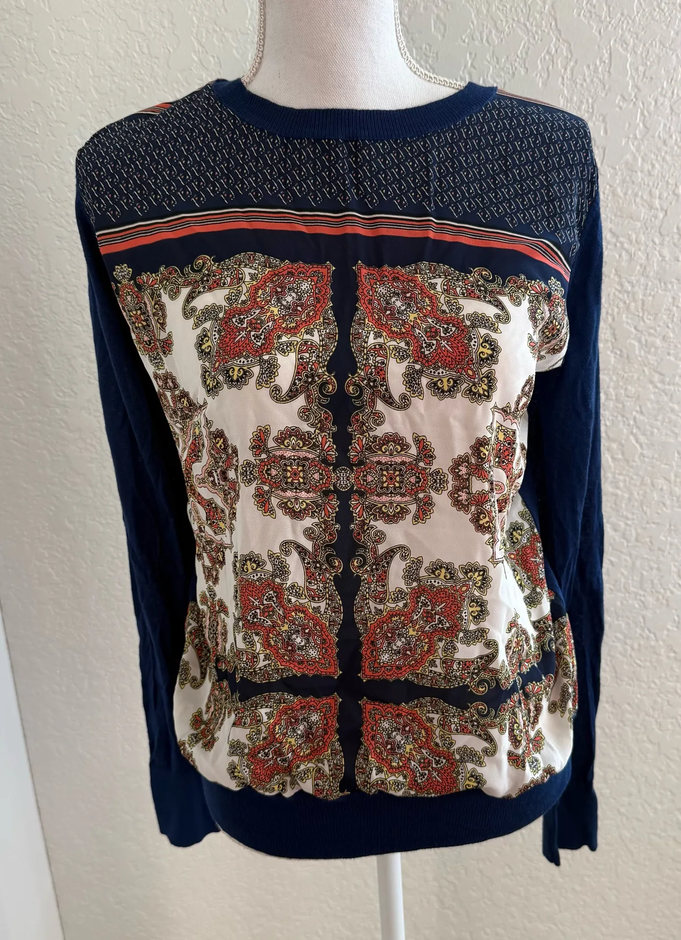 Chic top with intricate patterns. Features navy and orange hues. 41 Hawthorn mixed media long-sleeve sweater with a contrasting paisley scarf print front and blue knit sleeves and back. Light and Airy. Perfect for casual wear. Size Large NWT