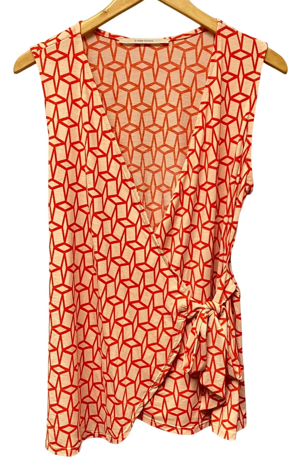 Preloved in excellent condition Women's size L Please see all photos for close up details and measurements. Type: Blouse Department: Women Style: Tunic Material: Polyester, Spandex Neckline: V-Neck Sleeve Length: Sleeveless Pattern: Geometric Accents: Strap Fabric Type: Knit Occasion: Casual Closure: Tie Season: Summer, Spring Garment Care: Hand Wash Only Country of Origin: United States Unit Type: Unit Keywords: Hawthorn, wrap top, geometric, coral, sleeveless, tie waist, V-neck, patterned, casual, brunch, vacation, feminine, bold print