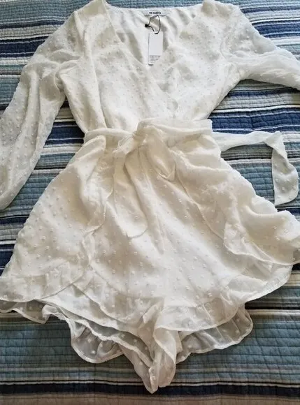 The wrap style bodice has a snap closure Elastic waist with matching tie Long balloon sleeves with e... Show more