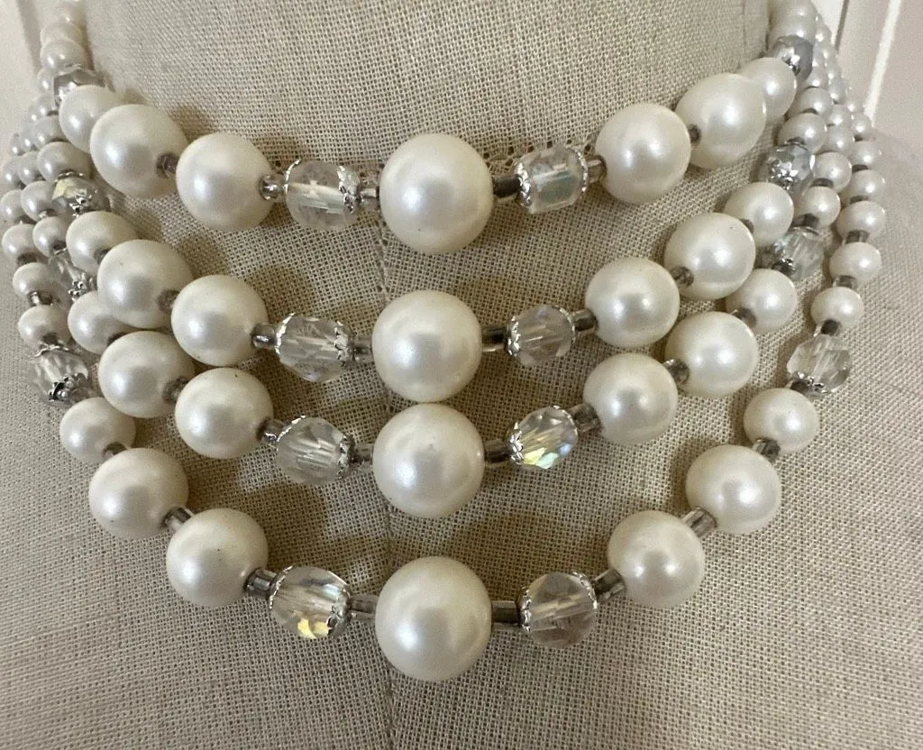 Japan Stamped Multi-Strand Faux Pearl & Crystal Necklace ✨ Glam multi strand collar necklace with creamy faux pearls, faceted crystal beads, and silvertone bar ends. Graduated layers drape beautifully and catch the light—classic mid-century Japan export style with hook adjustable closure. Perfect for bridal, holiday parties, or Old-Hollywood vibes 💃 Styling tip: Let it shine with a little black dress or a crisp white blouse—instant statement 🖤 Bundle to save! Free gift with a purchase of 3 or more items. 📦 Same or next day shipping & packed with care. 📝 Photos are part of the description. Reasonable offers welcome! 🧼 Condition: Very good vintage condition—light surface wear to a few pearls and minor finish wear on metal; see all pics. 🙂 Love pearls? I’ve got a whole collection of pearl pieces—both authentic and faux—available in my shop! #JapanJewelry #FauxPearl #CrystalBeads #MultiStrand #StatementNecklace #Bridal #OldHollywood #VintageStyle #CostumeJewelry