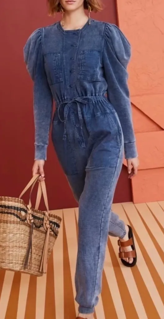 Ulla Johnson $445 Retail Preloved Sadie Puff Sleeve Jumpsuit Indigo Acid Blue No size label Fits like a medium as a relaxed fit Button closure Elastic waist Joggers Looks like denim but feels like sweats. Extremely comfortable.