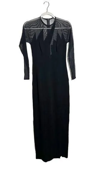 Absolutely gorgeous vintage maxi dress by Tadashi. Dated from the 90's this dress features long sleeves, illusion mesh throughout sleeves and neckline, and a zig zag 'lightning bolt' cut out at chest. Fitted, bodycon style. Back zip. Laying flat, armpit to armpit measures 15", waist is 12.5", and length is 56". Excellent vintage condition with just one light spot near the bottom of the front of the dress, as shown in photo. Should come out with cleaning.