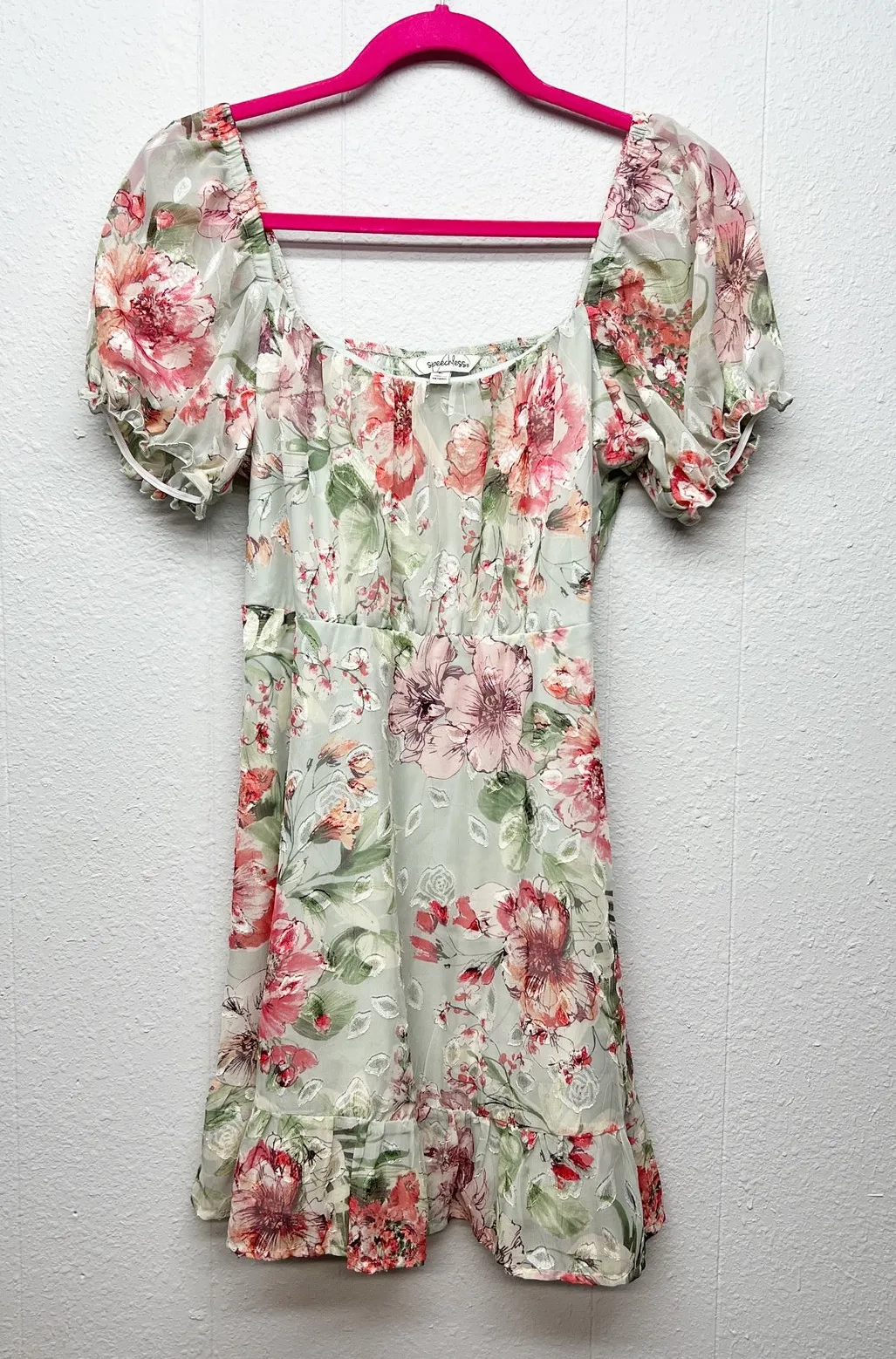 Speechless juniors floral chiffon babydoll dress. Scoop neck. Puff short sleeves. Smocked in back. R... Show more