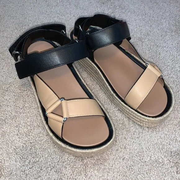 NWT (in box) - Excellent condition - Aerosoles - Dave, black combo, espadrille, 2" platform wedge sandals. Adjustable velcro strap closure, round open toe, rubber lug sole and synthetic upper and lining. Size women's 10.5 M