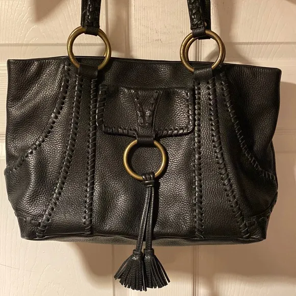 Black leather whipstitched “Whip it Good” Angela tote from Isabella Fiore. Magnetic closure, exterior pockets, leather tassel detail, brass signature Isabella Fiore hardware throughout, black and white fabric interior, whipstitched double handles. Large and roomy tote in very good condition. Very high quality piece.
