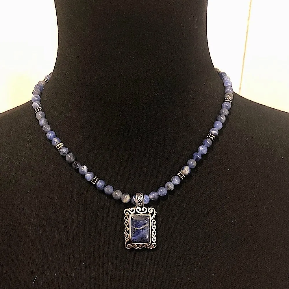 Southwestern Blue Sodalite Beaded Choker Necklace & Lapis Lazuli and Sterling Silver Pendant with Extension Southwestern Lapis Lazuli Pendant With Sterling Silver Scroll Cutout Frame Blue Sodalite Honed Beads and Sterling Silver Spacers Spring Clasp Measurements Taken Flat By Hand: Approximate Measurements: Necklace: Length: ~19” Long Including Extension Length: ~3” Extension Marked: 925 Pendant: Marked: 925 Adjustable Necklace Length: From Beaded Choker Gemstone Necklace at 16” length, to longer necklace at 19” length with additional attached 3” extension CARE: Avoid Chemicals/Polishes As They May Strip Manufacturer’s Finish, Yellow Vintage Silver, Damage Porous Gemstones. Store In Airtight Jewelry Bag When Not In Use To Prevent Tarnishing. Consult Professional Jeweler For All Sizing, Maintenance Requests To Prevent Irreversible Damage. Colors May Vary Based On Shadows, Lighting, Monitor, Display Settings Ask Questions and/or Request Additional Photos, Measurements as Needed Photos of Measurements are Available in The Slides No Returns, No Exchanges, No Trades, No Cancellations, No Accidental Bids ALL PHOTOS, DESCRIPTIONS, INTELLECTUAL PROPERTY ARE COPYRIGHT PROTECTED. ALL LEGAL RIGHTS RESERVED AND PROTECTED BY DMCA AND WILL BE LEGALLY ENFORCED.