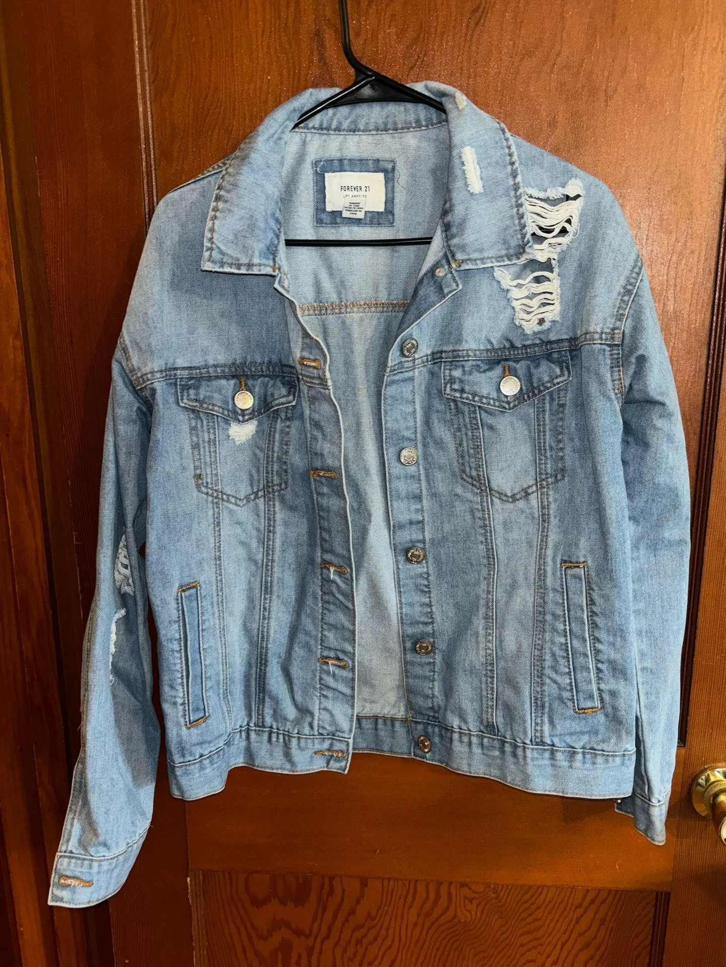 Super cute, distressed Forever 21 jean jacket, size medium. Like new condition.