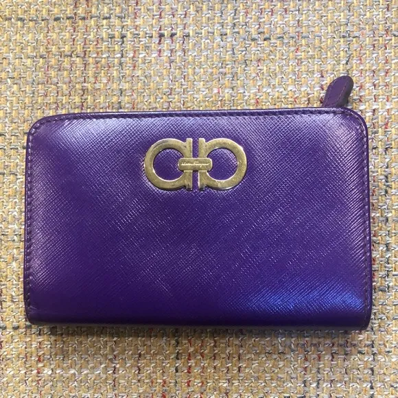 SALVATORE FERRAEGAMO Gancini Purple Saffiano Leather Bifold Full Zip Coin Section Wallet SALVATORE FERRAEGAMO Purple Saffiano Leather Bifold Wallet Made In Italy Full Zipper Coin Section Closure Leather Tab Snap Closure Over Bifold Wallet Section Room For Ten Dedicated Credit Cards Two Billfolds and Interior Section Within Wallet Photos of Measurements Are Available In The Slides Color May Vary Based On Shadows, Lighting, Monitor, Display Settings Ask Questions and/or Request Additional Photos, Measurements as Needed $525