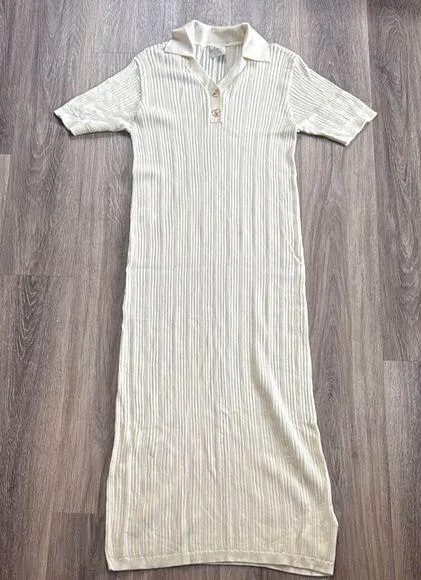 Full length with a button-down V-neck and oversized collar, the Andrea maxi dress is a timeless silhouette. In our Fine Rib Pointelle Knit, this dress embodies a flattering shift-style fit complemented by relaxed sleeves. Like new condition with extra button. P21” L57” Same dress as stock photo but the one for sale is cream.