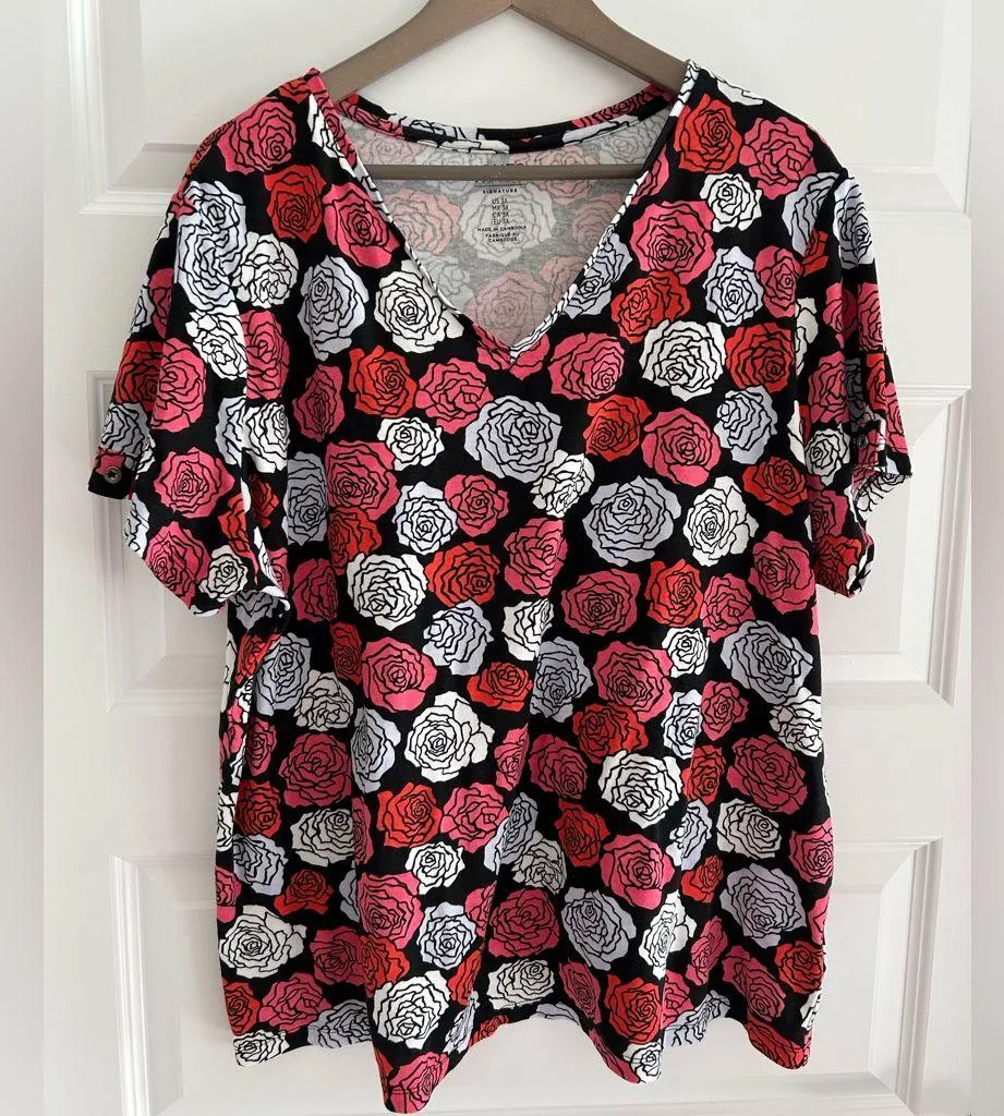 Jones New York Signature roses floral V neck T shirt, black with red pink white roses, size 3X Butto... Show more
