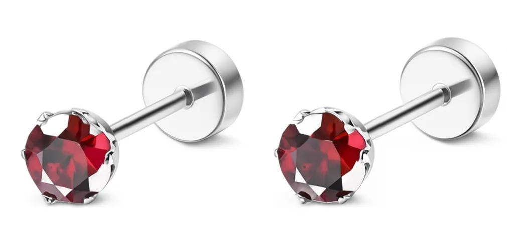 Add a touch of sparkle with these sleek 4mm red cubic zirconia stud earrings, crafted from durable stainless steel. The vibrant red stones are securely set in a prong setting, offering a bold yet elegant look. Featuring a flat screw-on back for secure, comfortable wear, these hypoallergenic studs are perfect for daily use or special occasions. Ideal for sensitive ears and designed to resist tarnishing and fading over time.