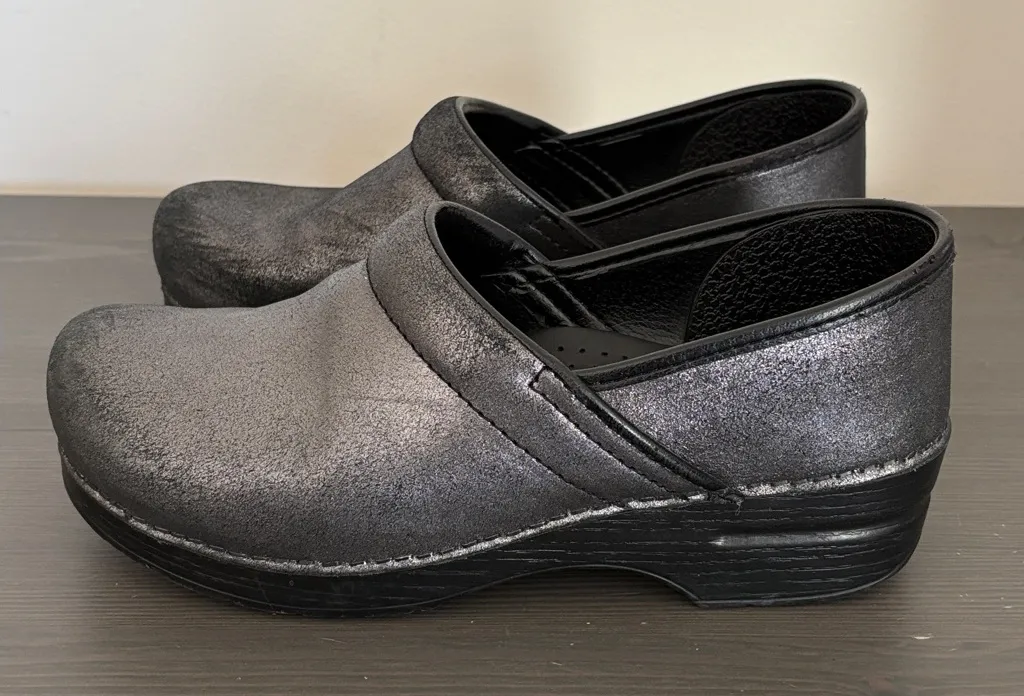 Ultra comfort for these metallic suede iconic clogs detailed with padded ankle, roomy reinforced toe box, wide heel and PU outsole. Good condition. Normal/light wear around edges. Please see all photos.