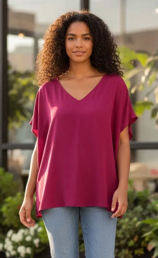 Beautiful Torrid blouse in a bold berry pink. Flowy fit with V-neck front and strappy tie-back detai... Show more