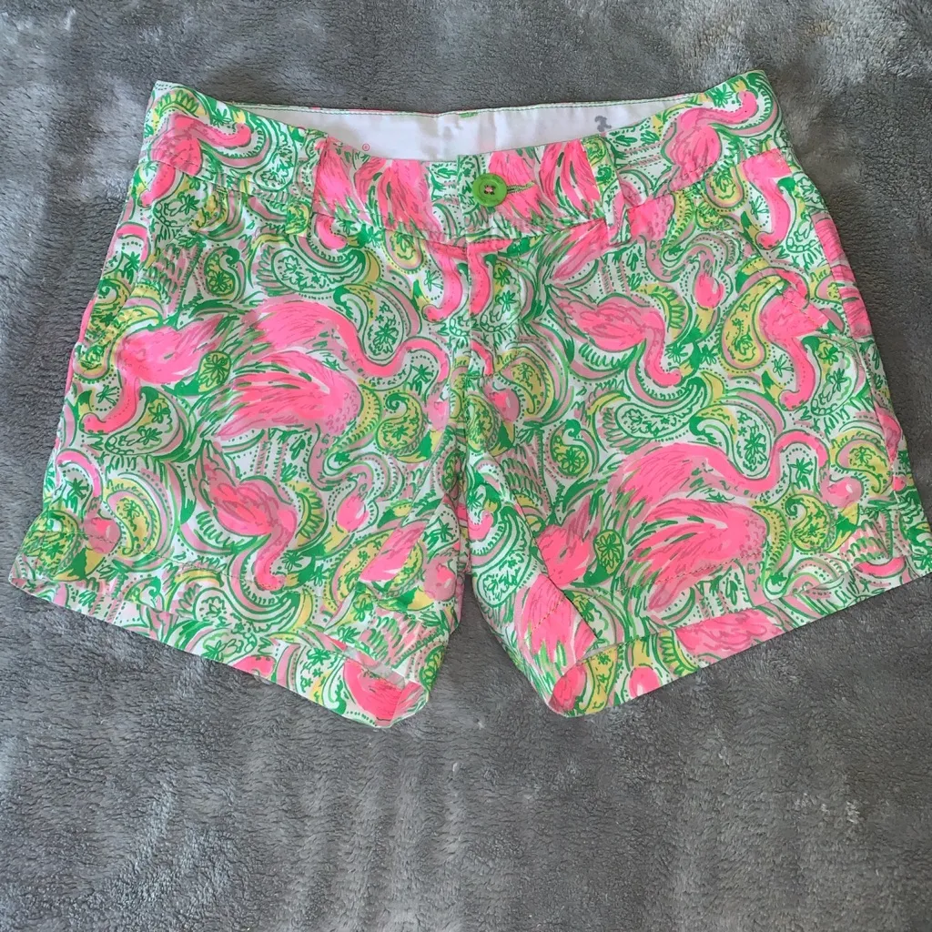 Lilly Putlitzer Size 0 The Callahan Short Green, Pink and White Paisley Flamingo Pattern 4 Pockets... Show more