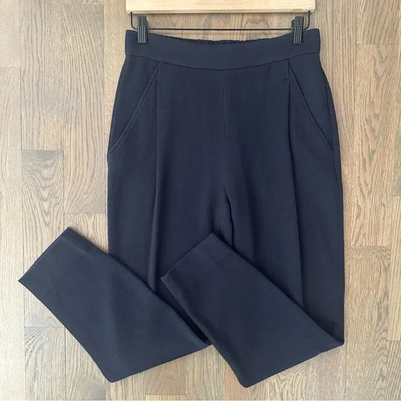 Vince textured high waist pleated trouser pant. Waffle knit pleated pant in dark navy blue. Slash po... Show more