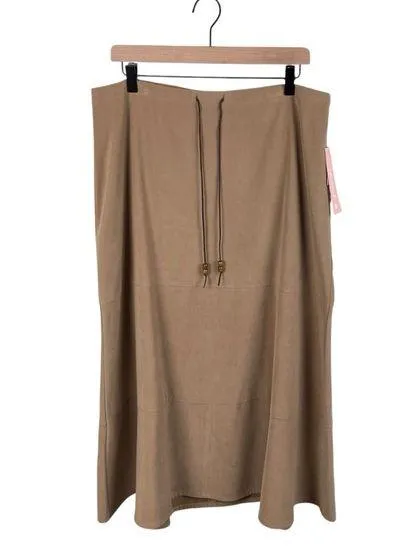 Vintage Dress Barn Woman Skirt Faux Suede Midi Maxi A-line Soft tan faux suede material A-line flare style skirt with three panels Adjustable beaded drawstring waist closure Polyester/Spandex Size 14 Brand new with tags! Approximate measurements: Waist: 17.5” across Hips: 25” across Length: 34.5” tags: vintage, 90s, 2000s, y2k, retro, cowgirl, coastal cowgirl, western, rodeo, boho, bohemian, casual spring summer fall, plus size, festival, trending, fairy, fairy grunge