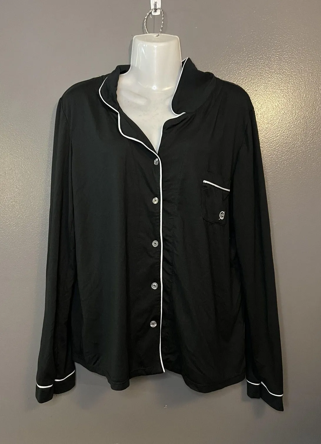 Brand: Børn (Born) crown logo on neck tag; small embroidered logo on chest pocket Item: Womens pajama shirt / sleep top Color: Black with white contrast piping Size: Large (L) tag size Fabric: 95% Polyester, 5% Spandex soft, stretchy knit Design: Button-front with notched collar; long sleeves; single chest pocket with piped trim Details: Embroidered circular Børn logo at pocket; classic pajama styling Care: Machine wash cold; tumble dry low; gentle cycle; cool iron; non-chlorine bleach only RN: 145219; Made in China Notes: Comfortable lounge and sleepwear top with timeless piping detail Very Soft PTP 22" Length 25" bin 5