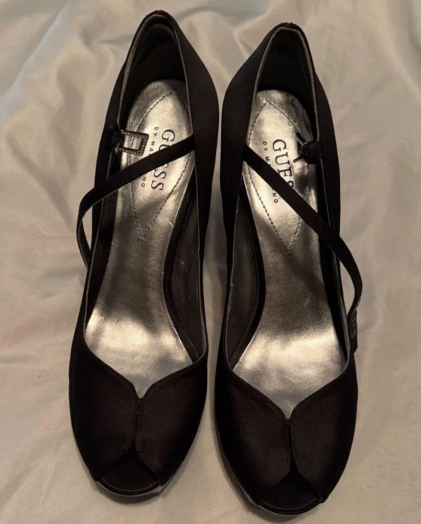 Chic black satin heels with elegant straps. Perfect for evening wear.