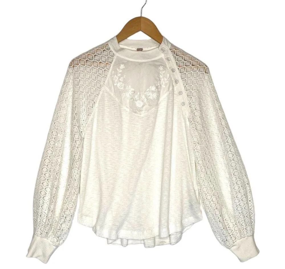 Free People Top Women's Waffle Embroidered Crochet Balloon Long Sleeve Ivory Size Small - 69% Polye... Show more