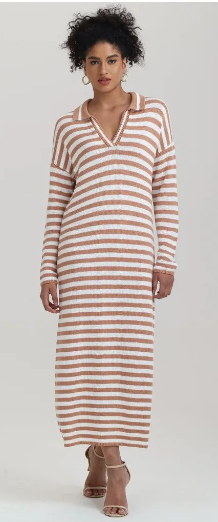525 America Raya Stripe Polo Knit Sweater Dress in Walnut Multi; like new, barely worn The best one-and-done option for transitional weather. The relaxed fit flatters your silhouette, while the sailor-stripe motif and tipped polo neckline add a modern twist. Relaxed fit; ankle length 100% Cotton Style#: 110015069 Length: 49" Tags: winter, sweater, knit, thick, striped, retro, minimal, quiet luxury, equestrian
