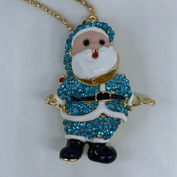 NEW without tags fashion shiny blue rhinestone Santa Claus pendant necklace. Santa Claus is wearing a blue rhinestone suit and his white beard is made of enamel. He measures 2 by 0.75 in (or 1 inch if you measure to the end of his hand). Chain is 27.5in. Santa’s head is mechanical and moves from side to side. Be sure to check out my other items and bundle for a great deal. I have multiple Santa necklaces in several colors! This Santa’s hand is longer on this piece than the others.