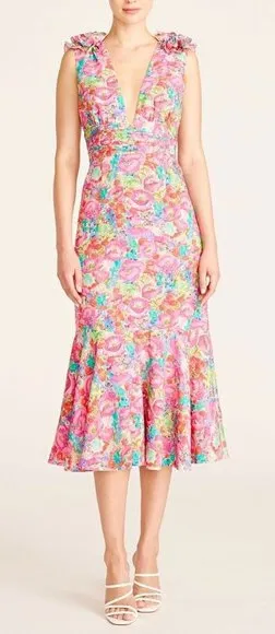 $548 NWOT Amur Womens 3D Flowers Below Knee Deep V Neck Floral Midi Dress 4 Pink - $280 - From Angela